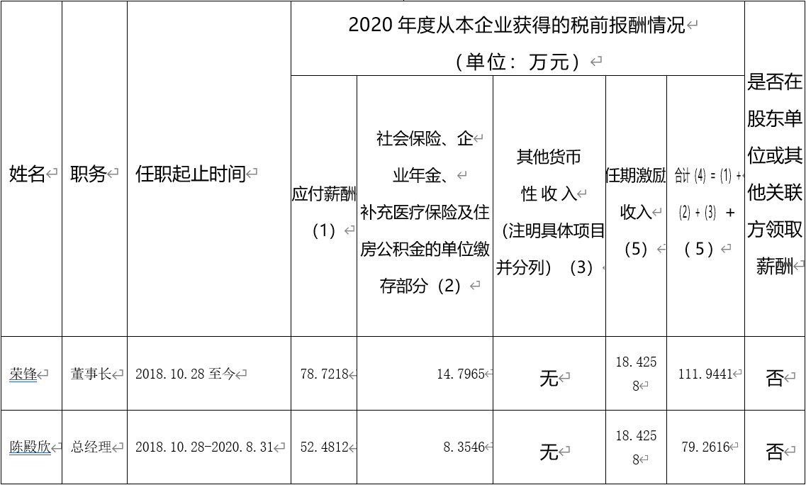 备注:上表为我公司董事长2020年度全部应发税前薪酬、总经理2020年1至8月全部应发税前薪酬。